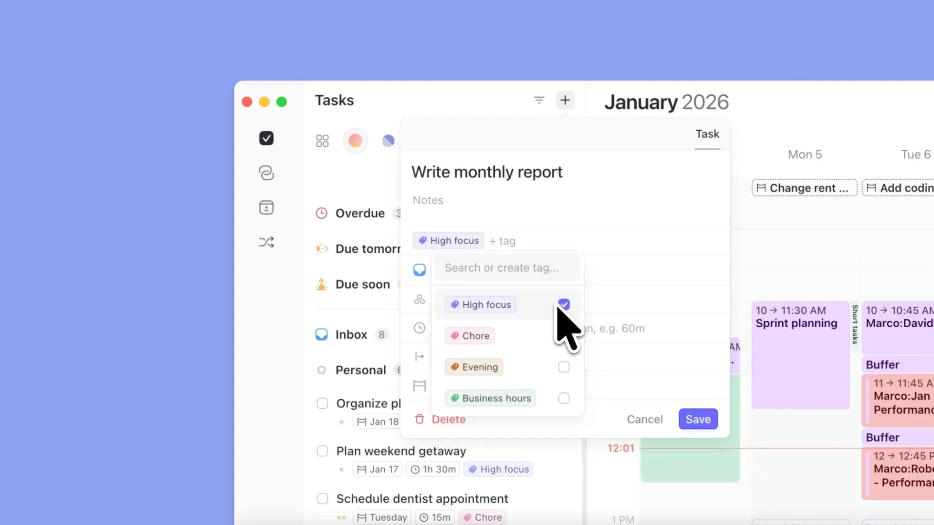Filter tasks by tag (including in Frames and the Planner)