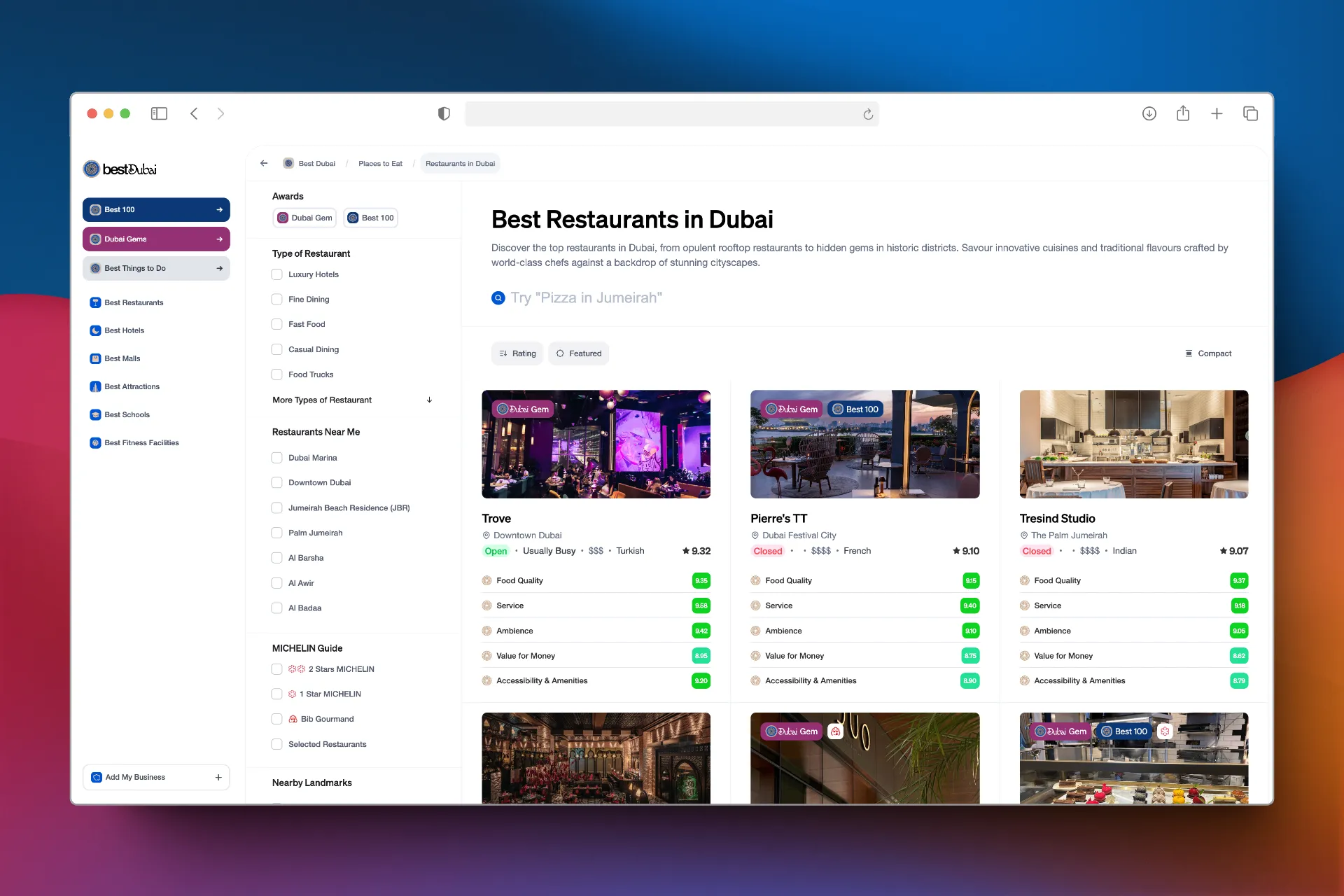 Simplify your search for the top destinations in Dubai with BestDubai.com, the platform that uses AI to evaluate and rank places and activities using public data, reviews, and expert input. Find the best experiences without the guesswork.