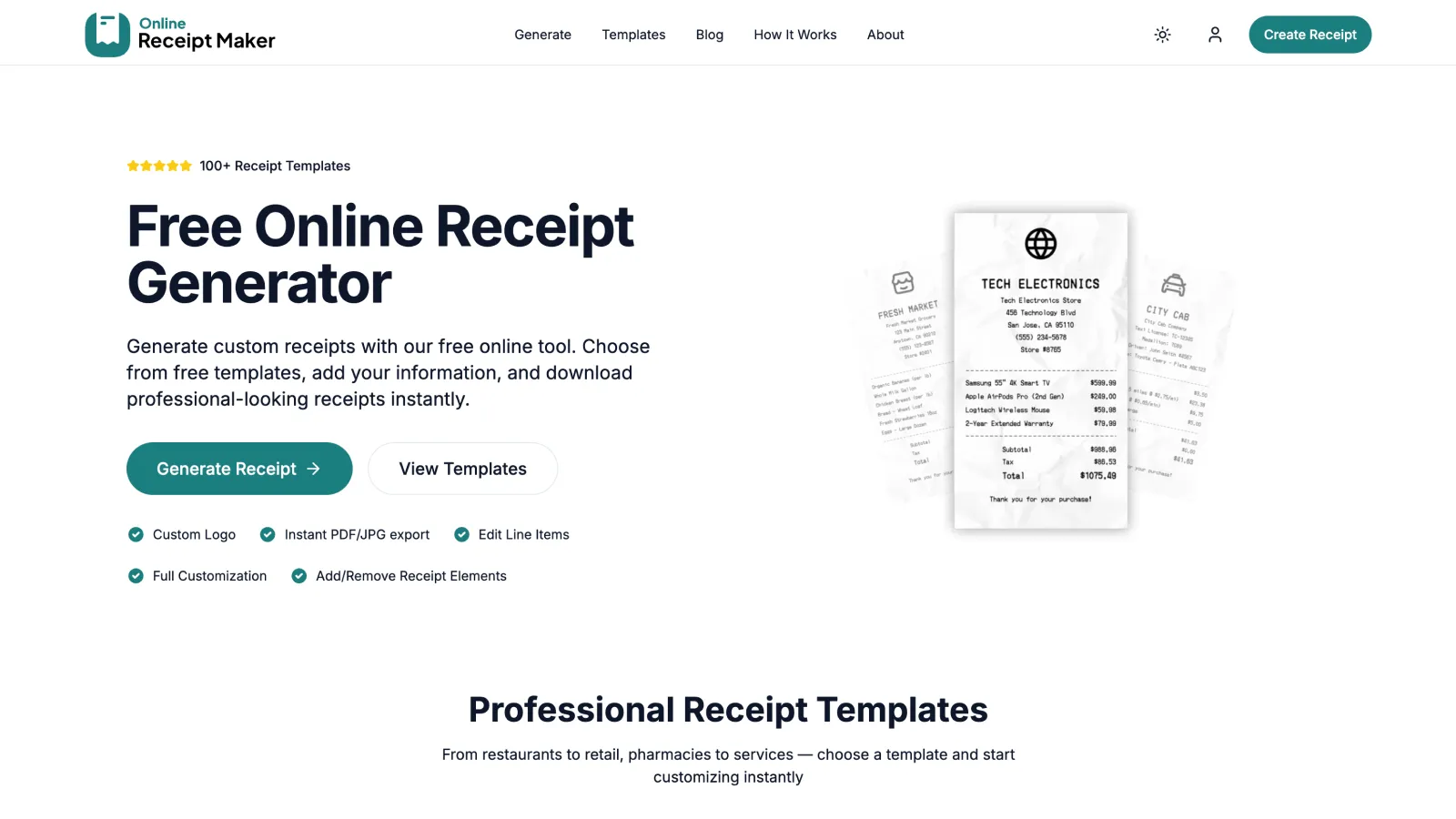 Online Receipt Maker helps businesses, freelancers, and self-employed professionals create professional receipts and invoices in seconds without the hassle of manual paperwork. Instead of spending time formatting documents or dealing with complicated software, you simply fill in your transaction details and get a polished, ready-to-send receipt instantly.​