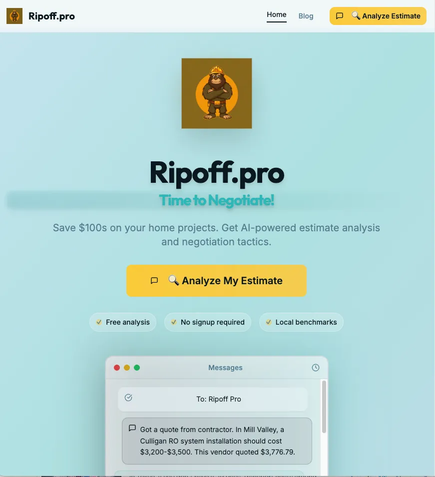 Ripoff.pro is your AI assistant for contractor quotes. Upload a photo or PDF, and we’ll analyze the details against real market rates. You’ll see which charges are inflated or unclear and get a negotiation playbook you can send right back over text. For big-ticket projects, you can also request alternative bids or expert reviews. With no spam or sales pressure, Ripoff.pro delivers quick, private, and transparent pricing guidance so you can make smart hiring decisions for any home project.
